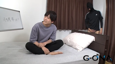 騎乗位、バックとマスクマンの容赦無いガン突きにヨガリまくりのおっとり大学生くん。自分でチンポを扱きながら正常位で掘られていくと「イグッ…」と言いながら大量の濃厚ザーメンを放出♂それを見たマスクマンのピストンも早くなり「中に出していい?」と種付け宣言!もちろんおっとり大学生くんの返事はOKなのでそのまま豪快に大量のザーメンを種付け!!